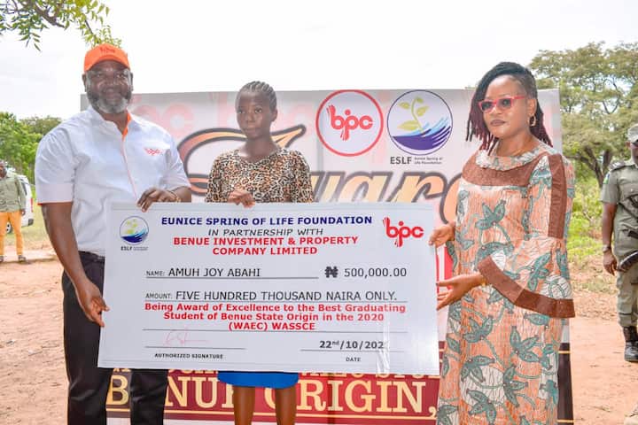 Joy Abahi Amuh of St. Paul Secondary School, Otukpo, Benue State, was handed a prize of N500,000 by Benue Investment and Property Company (BIPC) in partnership with a Non-Governmental Organisation, Eunice Spring of Life Foundation (ESLF).