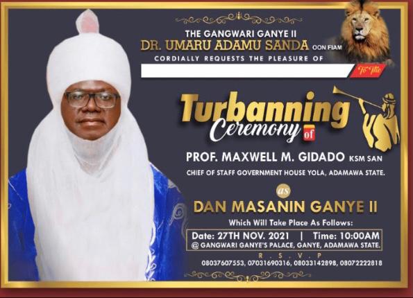 The turbanning ceremony is scheduled to take place on Saturday, 27th of November, 2021 at the Gangwari Ganye’s palace in Ganye Local Government Area of Adamawa state.