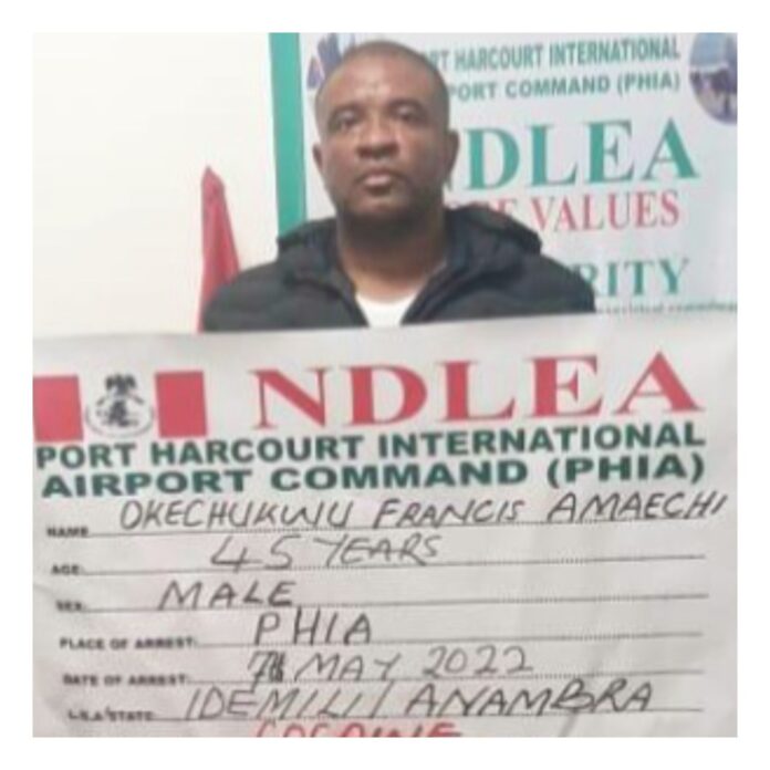 Disclosing the arrest in a statement issued on Sunday by NDLEA spokesman, Femi Babafemi, the 45-year-old ex-convict from Idemili South Local Government Area (LGA) Anambra State was intercepted at the Port Harcourt airport on Saturday May 7, 2022 upon his arrival from Brazil via Doha onboard Qatar Airline flight QR1433.
