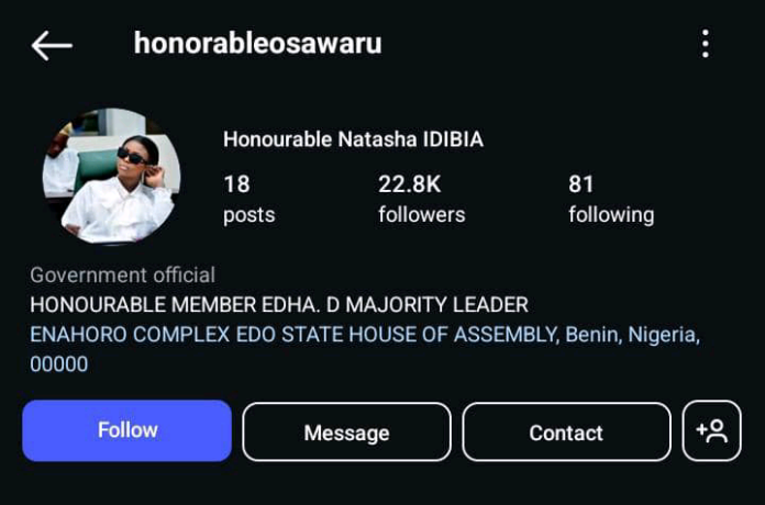 Her Instagram bio currently reads, “Honourable Natasha Idibia.”