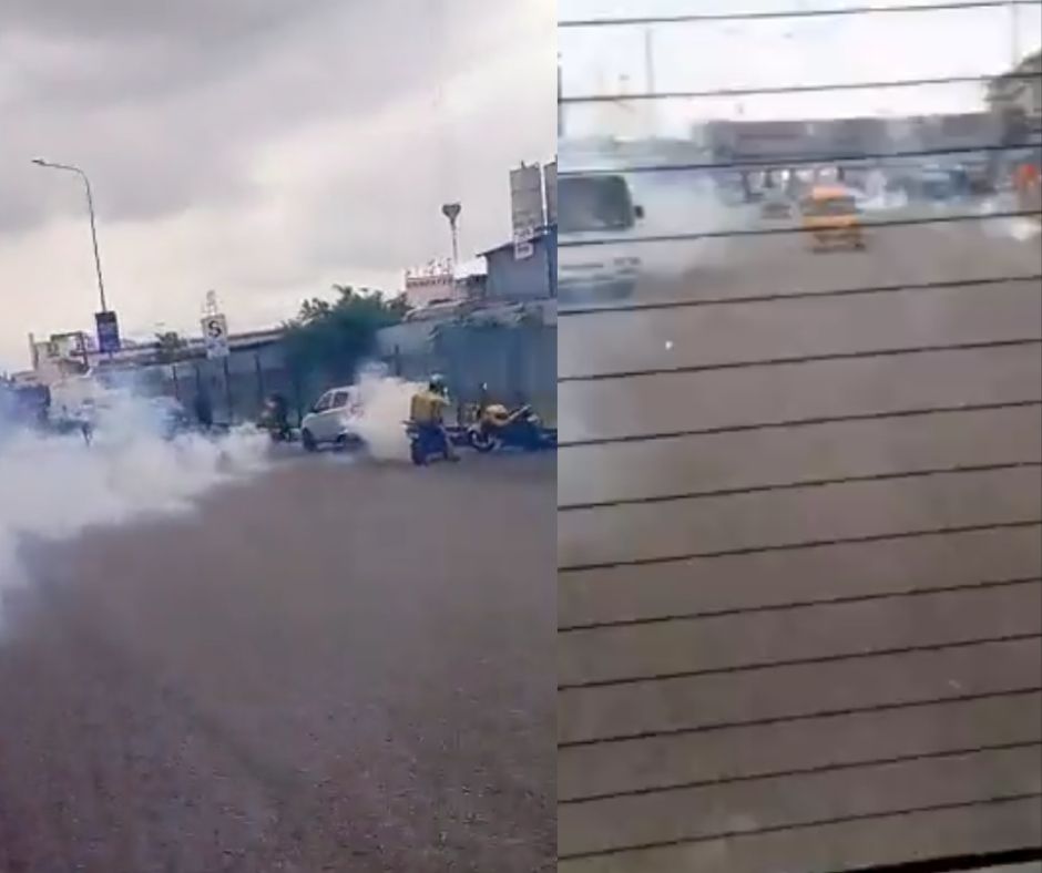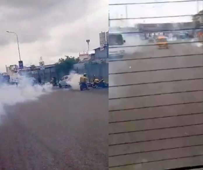In a video obtained by Neptune Prime, police officers were seen firing some tear gas canisters on the road to disperse protesters at the toll gate.