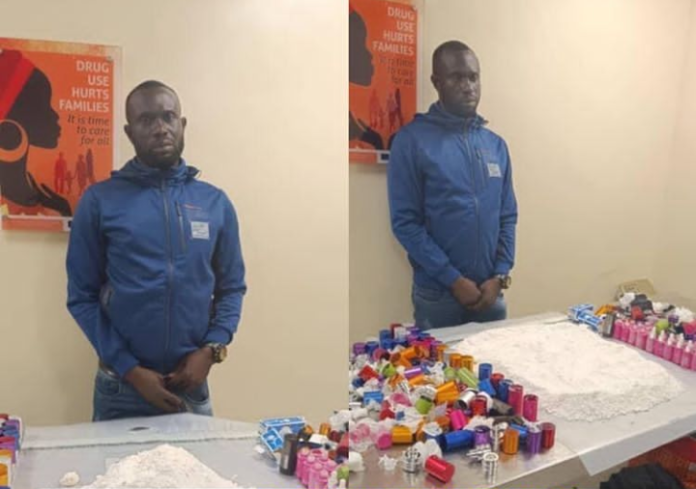A 44-year-old Onyeka Charles Madukolu, who served a two-year jail term in Ethiopia was on Friday, September 16 arrested by operatives of the National Drug Law Enforcement Agency (NDLEA) at the Murtala Muhammed International Airport, Lagos for importing 5.90 kilograms of cocaine concealed in cans of deodorants and ladies lip gloss into the country.