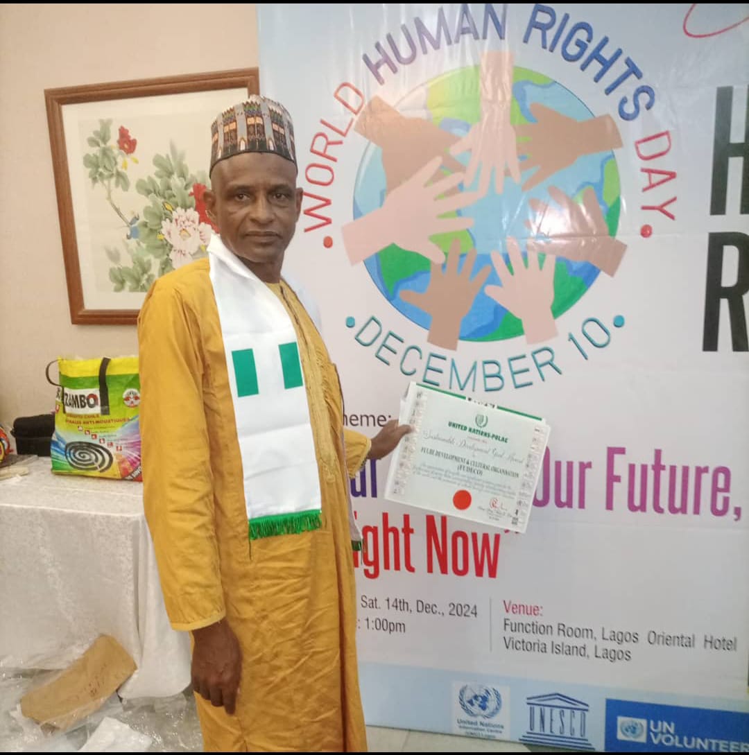 The Fulbe Development and Cultural Organisation (FUDECO) has received the esteemed United Nations Positive Livelihoods Awards Centre (UN-POLAC) Sustainable Development Goals (SDG) Award. The accolade was conferred during the 2024 United Nations Human Rights Day celebrations at the Oriental Hotel, Lagos Island, Nigeria.