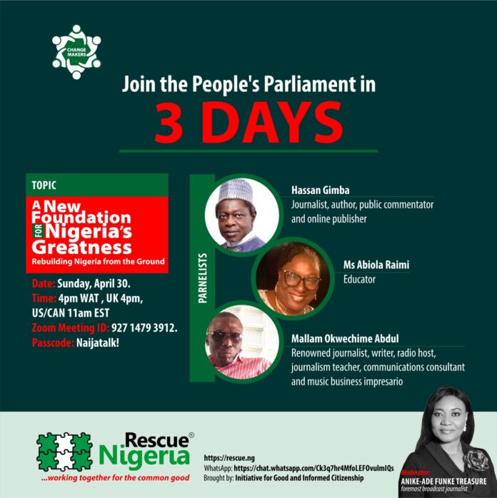 The Rescue Nigeria will be hosting a people’s parliament on Sunday, April 30th at 4PM (WAT, UK 4pm, US/CAN 11am EST) with Neptune Prime CEO/Publisher, Malam Hassan Gimba, UK educator, Ms Abiola Raimi and renowned journalist/reporter Malam Okwechime Abdul as guest panelists.