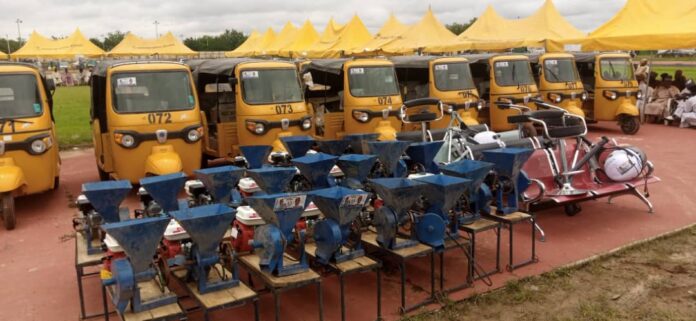 The items distributed include: 213 Lion Sewing machines, 136 TL3D Embroidery machines, 136Tricycles, 50 Thermacool deep freezers, 134 Snow seat deep freezers, 50 200watts stabilizers, 49 Grinding Machines, 30 Wall dryers, 30 Hand dryer, 189 KLM Hair dryer, 188 PRO hair straightener, 30 Saloon chairs, 217 Electric drills, 982 Plastic desk locker, and chairs.