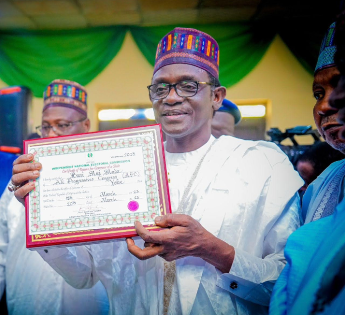 Governor Buni received his certificate alongside members-elect of the State House of Assembly at the Independent National Electoral Commission (INEC) office in Damaturu, Yobe State capital.