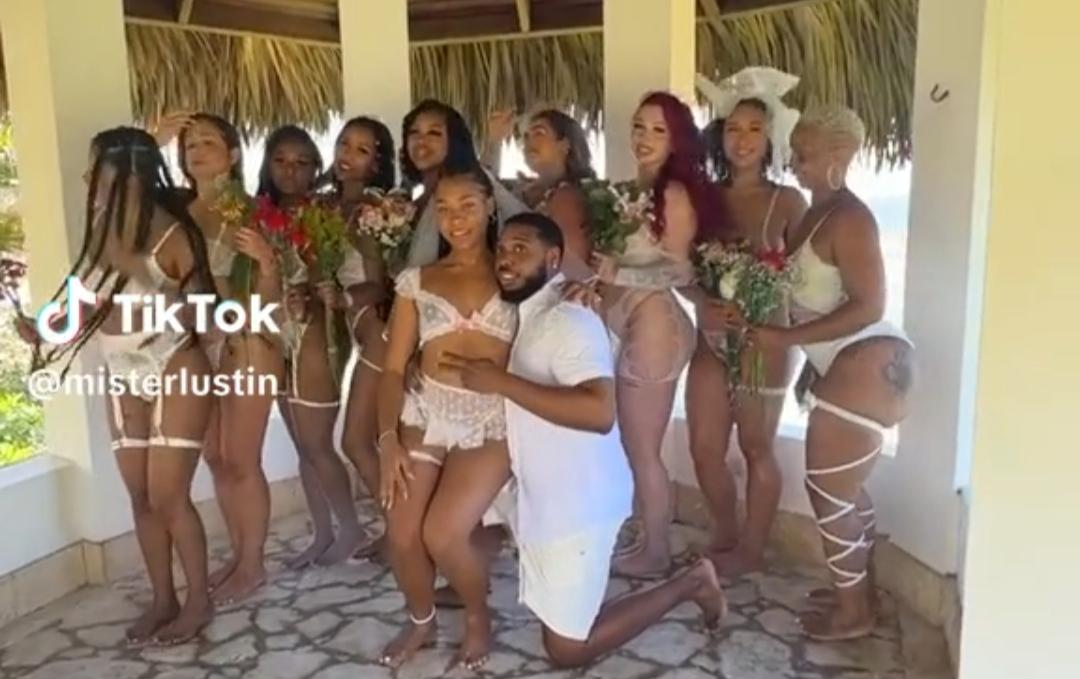 The video captures the groom exuding sheer happiness as he poses alongside his ten newly-wedded wives.