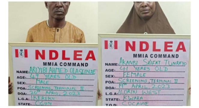 A widower, Ariyibi Ahmed Olaseinde and a divorcee, Akanbi Silifat Tunrayo who were going for lesser hajj in Saudi Arabia have been arrested by operatives of the National Drug Law Enforcement Agency, NDLEA, at the Murtala Muhammed International Airport, MMIA Ikeja Lagos for attempting to export 14.4 kilograms of cocaine concealed in lace and Ankara fabrics.