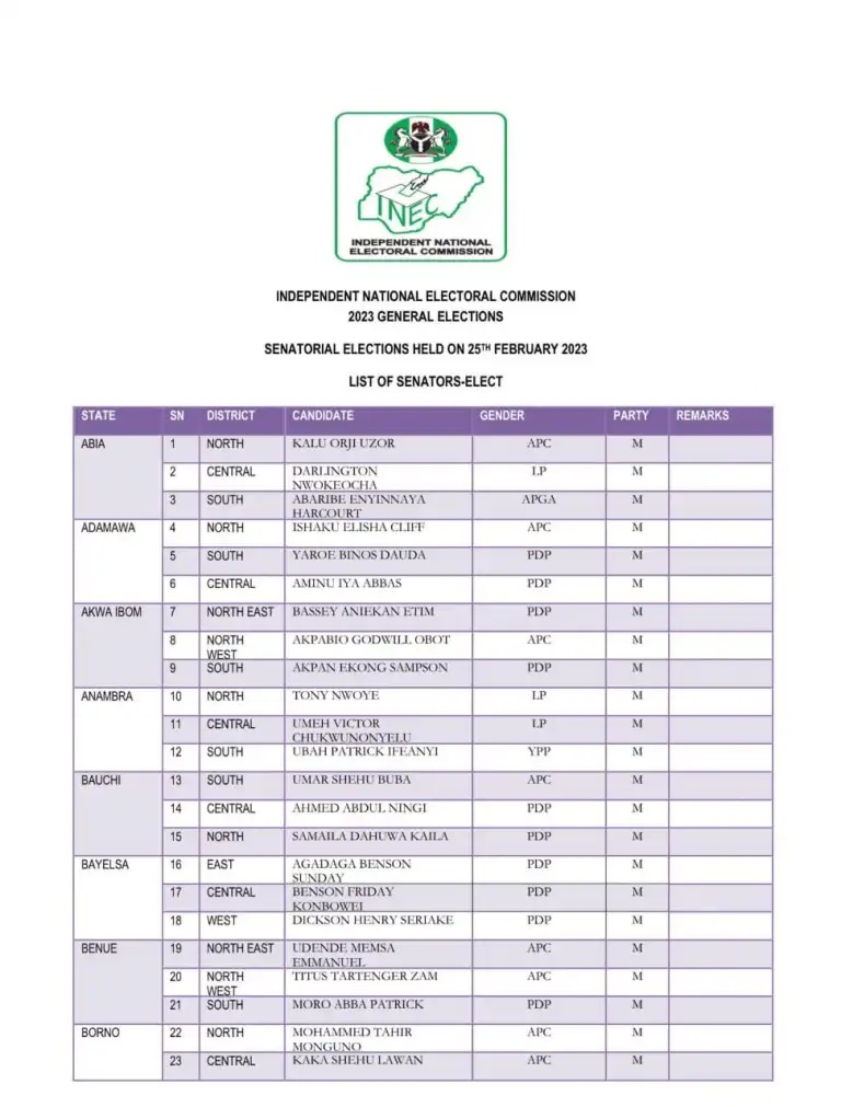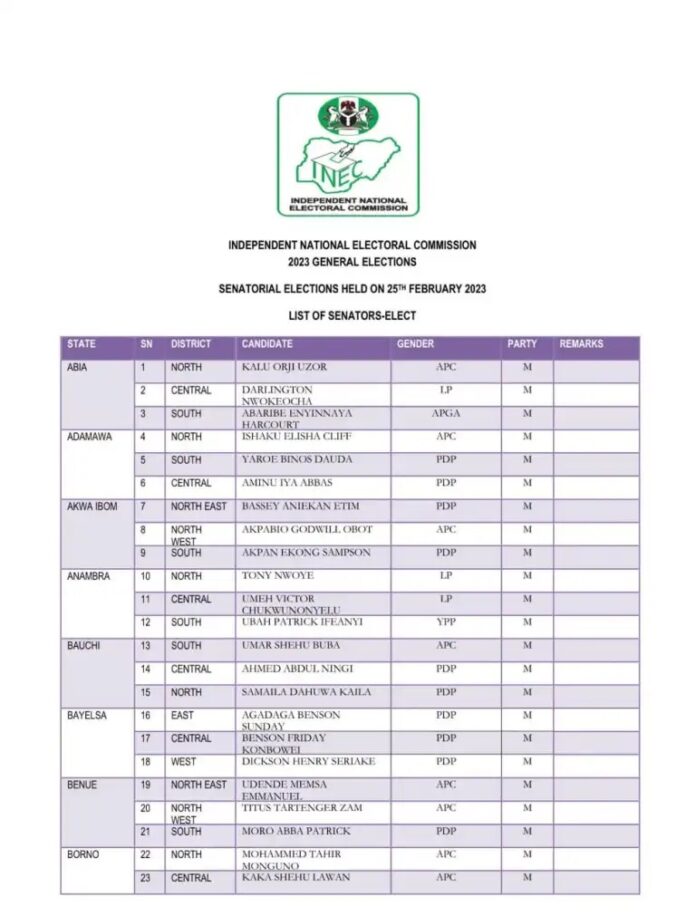 The Independent National Electoral Commission (INEC) has released the complete list of the 10th Senate’s incoming members who emerged winners at the just concluded National Assembly election held on February 25th, 2023.