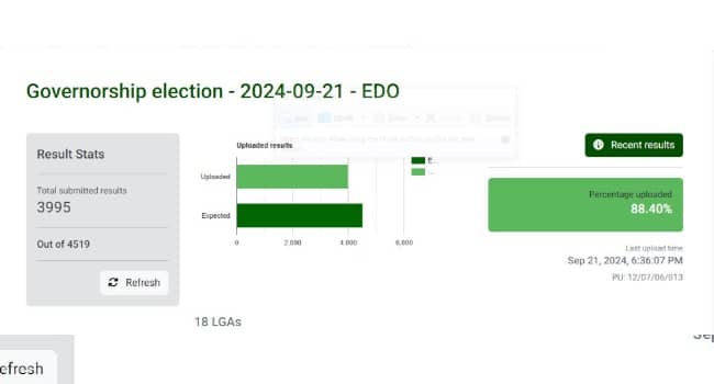 The Independent National Electoral Commission (INEC) has uploaded over 88% of polling unit results from the Edo State Governorship Election held on Saturday, September 21, 2024. As of 6:40 PM, INEC had successfully uploaded the result sheets from 3,995 out of the 4,519 polling units on its Result Viewing Portal (IReV).