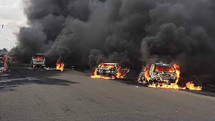 Some of the vehicles set ablaze were mostly commercial luxury buses, trailers, and trucks with crude oil, fifty feet containers, and open bucket lorries filled completely with goods which amounted to billions of Naira.