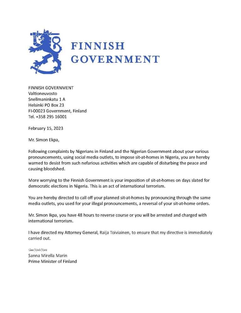 A source from the Finnish government has told Thecable that the letter threatening to arrest Simon Ekpa over his election day sit-at-home order is fake and didn’t originate from the government.