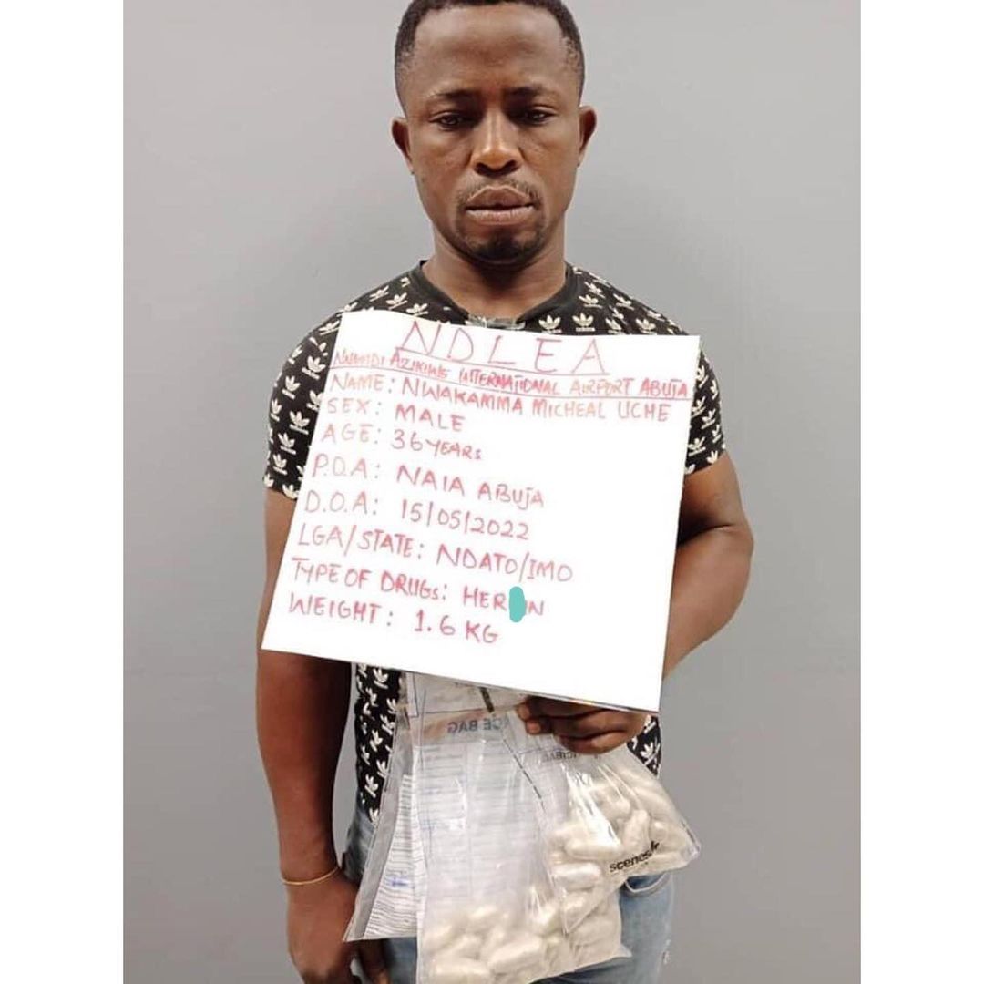 A 36-year-old Nigerian based in Italy, Nwakanma Michael Uche, has been arrested by operatives of the National Drug Law Enforcement Agency (NDLEA) at the Nnamdi Azikiwe International Airport, (NAIA) Abuja, for ingesting pellets of heroin.