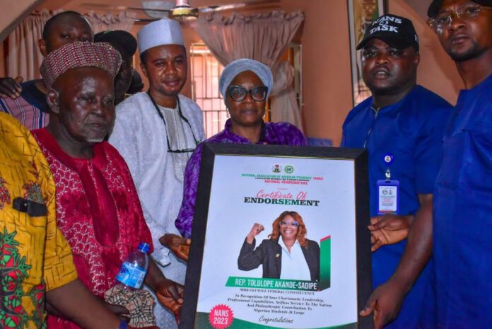 The National Association of Nigerian Students (NANS) has endorsed House of Representatives member, Tolulope Akande-Sadipe as their preferred candidate from the Oluyole Federal Constituency of Ibadan, Oyo State.