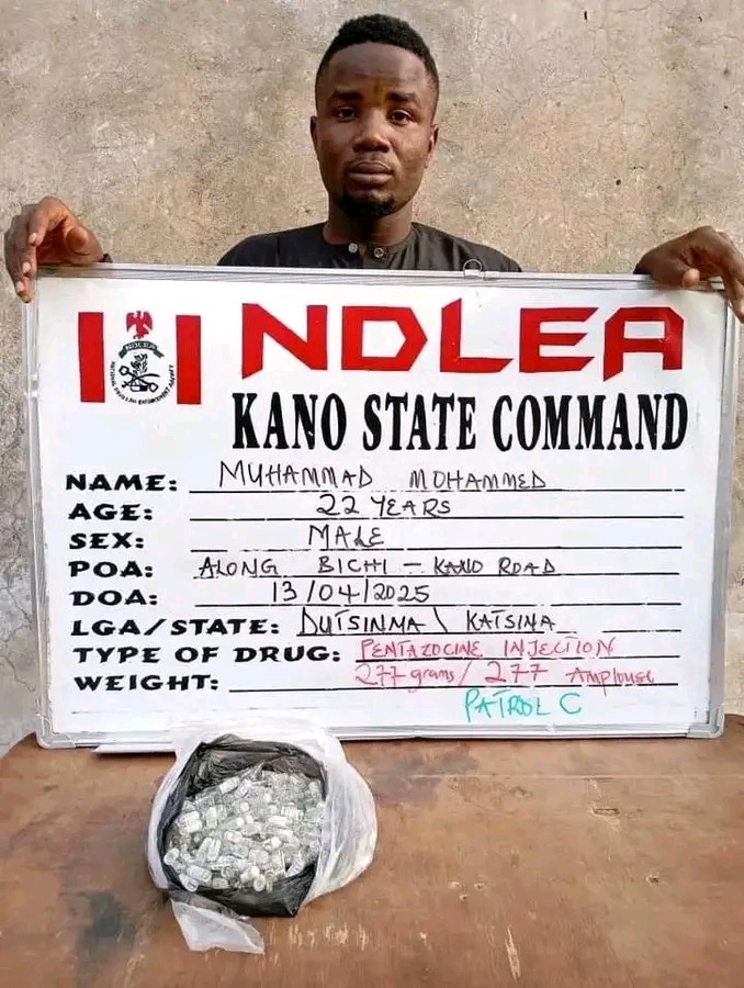 A 22-year-old drug courier, identified as Muhammad Mohammed, has been arrested by operatives of the National Drug Law Enforcement Agency (NDLEA) while attempting to transport a large quantity of illicit pharmaceutical substances to suspected bandits in Katsina State.