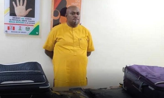 Operatives of the National Drug Law Enforcement Agency (NDLEA) have arrested a self-acclaimed businessman, Kingsley Celestino, with over 9.40kg of heroin concealed in false bottoms of his two travelling bags at the Murtala Muhammed International Airport, Ikeja, Lagos.