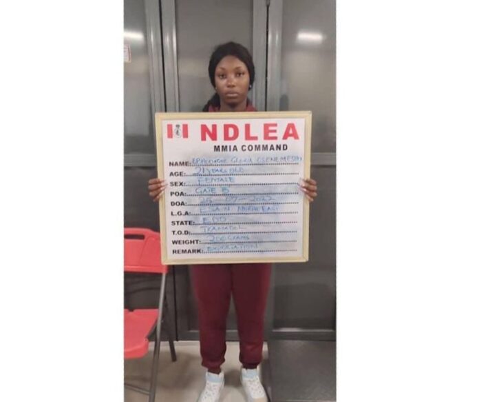 Operatives of the National Drugs Law Enforcement Agency (NDLEA) have arrested a young lady, identified as Ms. Ebhodaghei Gloria Osenemeshen, with illicit drugs at the Murtala Muhammed International Airport (MMIA), Lagos.