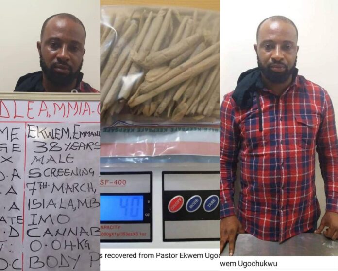 Operatives of the National Drug Law Enforcement Agency (NDLEA) at the Murtala Muhammed International Airport (MMIA) Command in lkeja, Lagos have arrested Reverend Ugochukwu Emmanuel Ekwem, the General Overseer of Christ Living Hope with 54 sticks of drugs wrapped around his body.