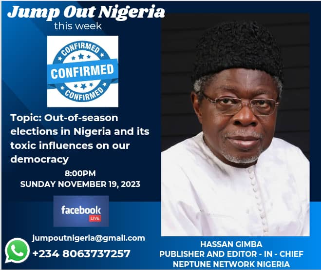 Neptune Prime CEO/Publisher, Dr Hassan Gimba, has been invited to participate on a Swedish-based radio programme, Jump Out Nigeria, on Sunday, 19th November 2023, where he will discuss a relatable topic: Out-of-Season in Nigeria and its toxic influences on our democracy.