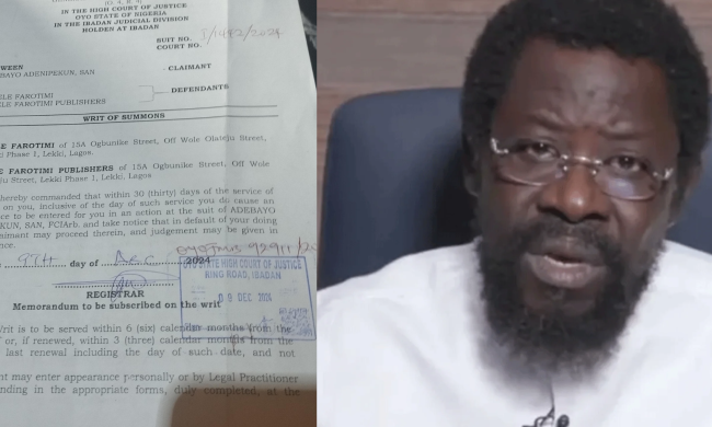 A prominent lawyer and Senior Advocate of Nigeria, Adebayo Adenipekun, has filed a lawsuit against human rights lawyer, Dele Farotimi, at the Oyo State High Court in Ibadan, Oyo State.