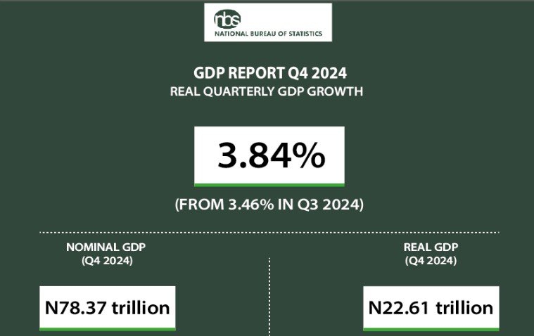 Nigeria’s gross domestic product (GDP) grew by 3.84% in the fourth quarter of 2024, according to a report released by the National Bureau of Statistics (NBS) on Tuesday.