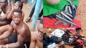 In a video seen by Sahara Reporters, the criminals were arrested with different guns, police shoes, a belt and a beret, a Biafran flag and charms.