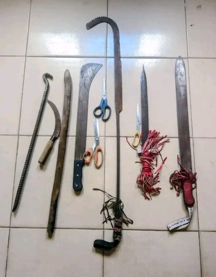 During the operation, police recovered cutlasses, a pair of scissors, and other dangerous weapons. An investigation is currently underway to arrest additional suspects who are still at large.