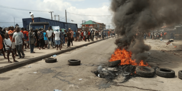 The protest started on a peaceful note, but later turned violent when trucks laden with petroleum products and granites were set ablaze, and a youth lost his life to stray bullet.