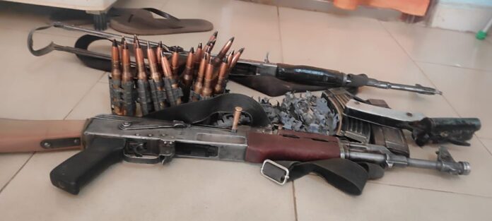 “The police recovered four AK47 rifles, one fabricated SMG rifle, one locally-made revolver pistol, one locally-made Beretta pistol, five empty magazines, twenty-two rounds of 7×62.51mm NATO ammunition, four rounds of 7×62.39mm ammunition and three Honda Bajaj motorcycles.