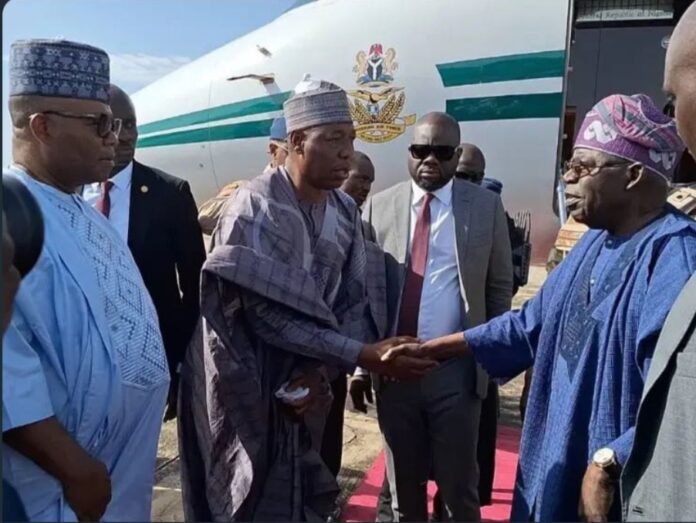 The president’s aircraft landed at the Maiduguri International Airport and was received by Governor Babagana Zulum and other government officials.