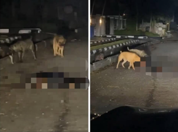 The distressing footage shows the dogs lingering around the lifeless body of the guard as he lay motionless on the ground.