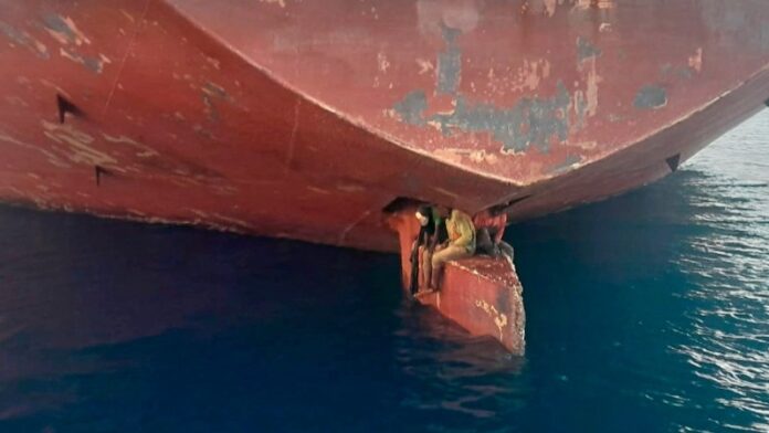 In a photograph distributed on Twitter by the Spanish coast guard on Monday, the three stowaways are shown crouching on the rudder under the hull, just above the waterline of the Alithini II.