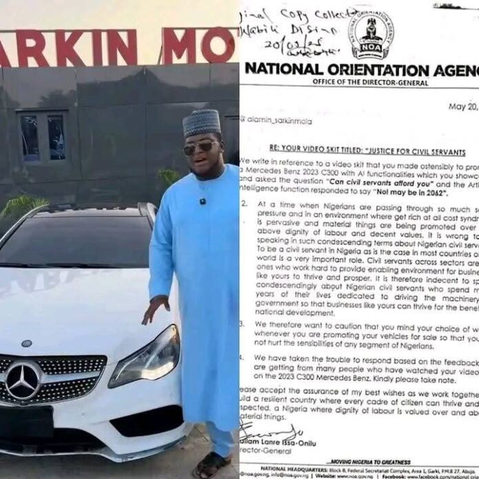 In a statement, the Director General, NOA, Malam Lanre Issa-Onilu, said the agency was forced to issue a caution to the dealer after a video went viral on social media, in which he apparently proved that civil servants cannot afford the kind of vehicles he sells.