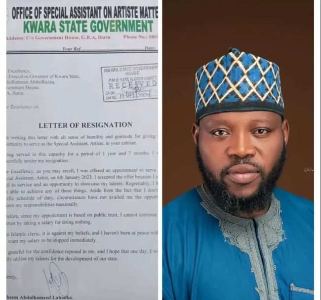 Ibraheem Abdulhameed, popularly known as Labaeka, has resigned from his position as Special Assistant on Artiste Matters to Kwara State Governor AbdulRahman AbdulRazaq.
