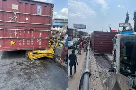 An articulated truck conveying a 20ft container fell on a commercial bus at Ojuelegba, Lagos on Sunday killing nine persons.