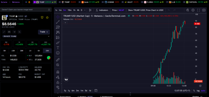 The price of $TRUMP surged by over 300% by Saturday morning and continued to climb into Saturday night.