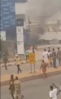 The videos shared on Monday showed many residents watching as Keystone and Union banks were set ablaze with some youths holding planks in protest.